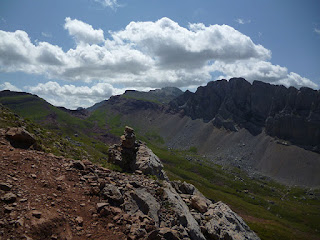 A partir de los 2000 metros de altitud aproximadamente no encaramos con las paredes del Castillo de Acher. Una estrecha senda asciende con fuerte pendiente por la ladera sur de nuestro objetivo. El sendero atraviesa ahora una zona de formaciones rojizas que deben su color a la oxidación de los minerales de hierro.
